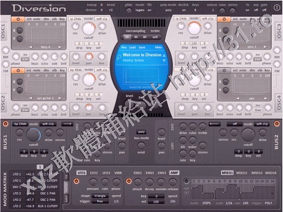 Diversion是一個軟體合成器,提供了很多過濾模式和飽和階段,靈活的影響矩陣,琶音和恍惚的